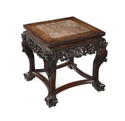the inset square rouge marble top within a bead moulded edge, over a pierced frieze, on cabriole legs carved with dragon heads and joined by curved stretchers, ending on claw feet