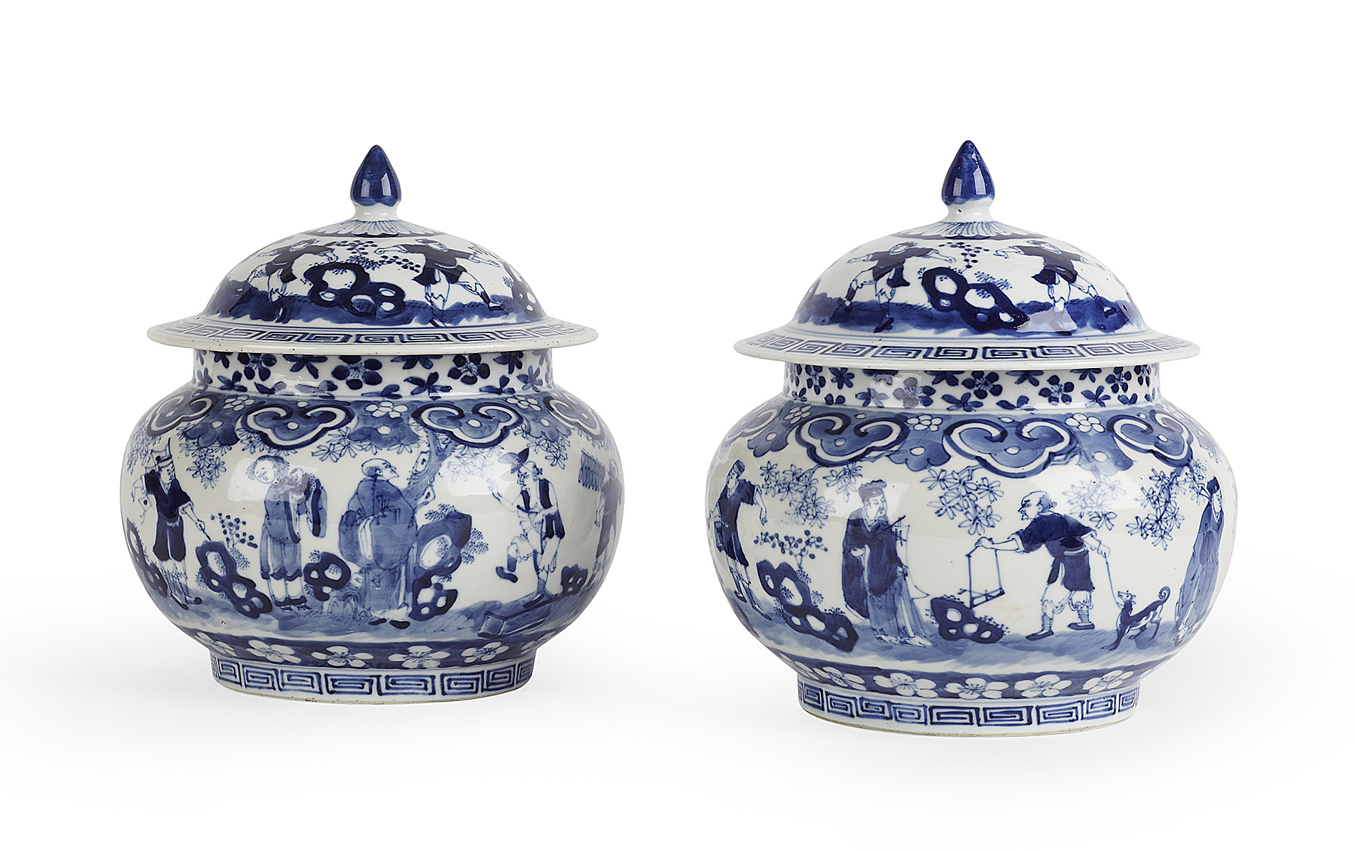 each of squat globular form with domed covers, depicting a continuous scene of figures playing and dancing in a landscape, blue seal marks to base (2)