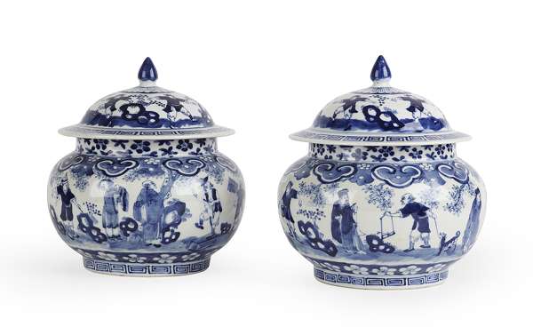 PAIR OF CHINESE BLUE AND WHITE COVERED JARS