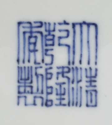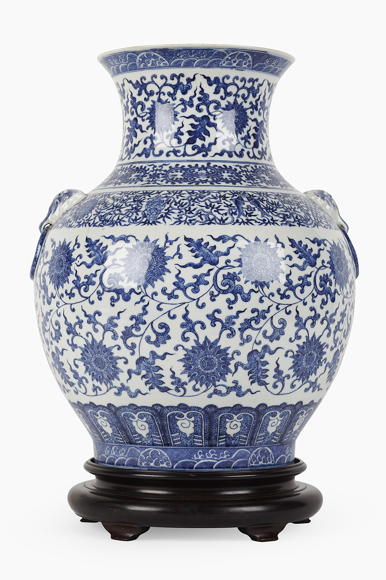 of hu form, the flared mouth above a short neck and bulbous body with moulded mask and loop handles, finely painted with bands of scrolling foliage and lotus blossoms, the shoulder with band of foliate scrolls and buddhistic symbols, the neck and foot rims with bands of wave motifs, the underside with Qianlong seal mark, but later