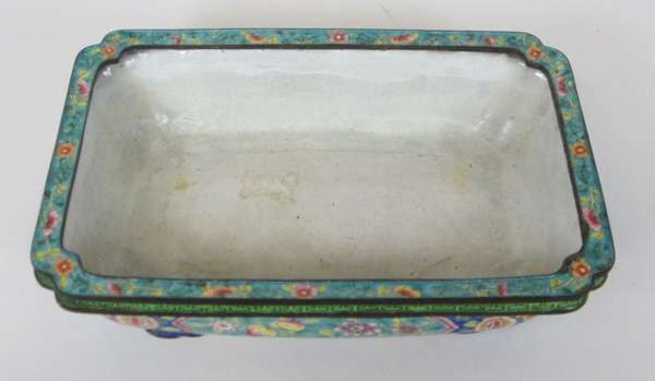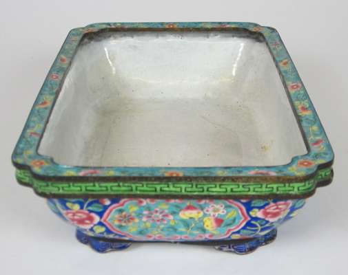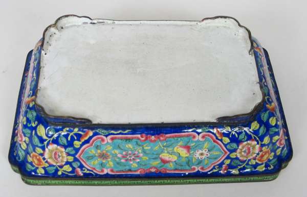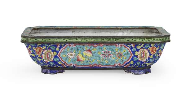 rectangular, the side panels with reserves decorated with peaches and flowers, against a blue flower filled ground