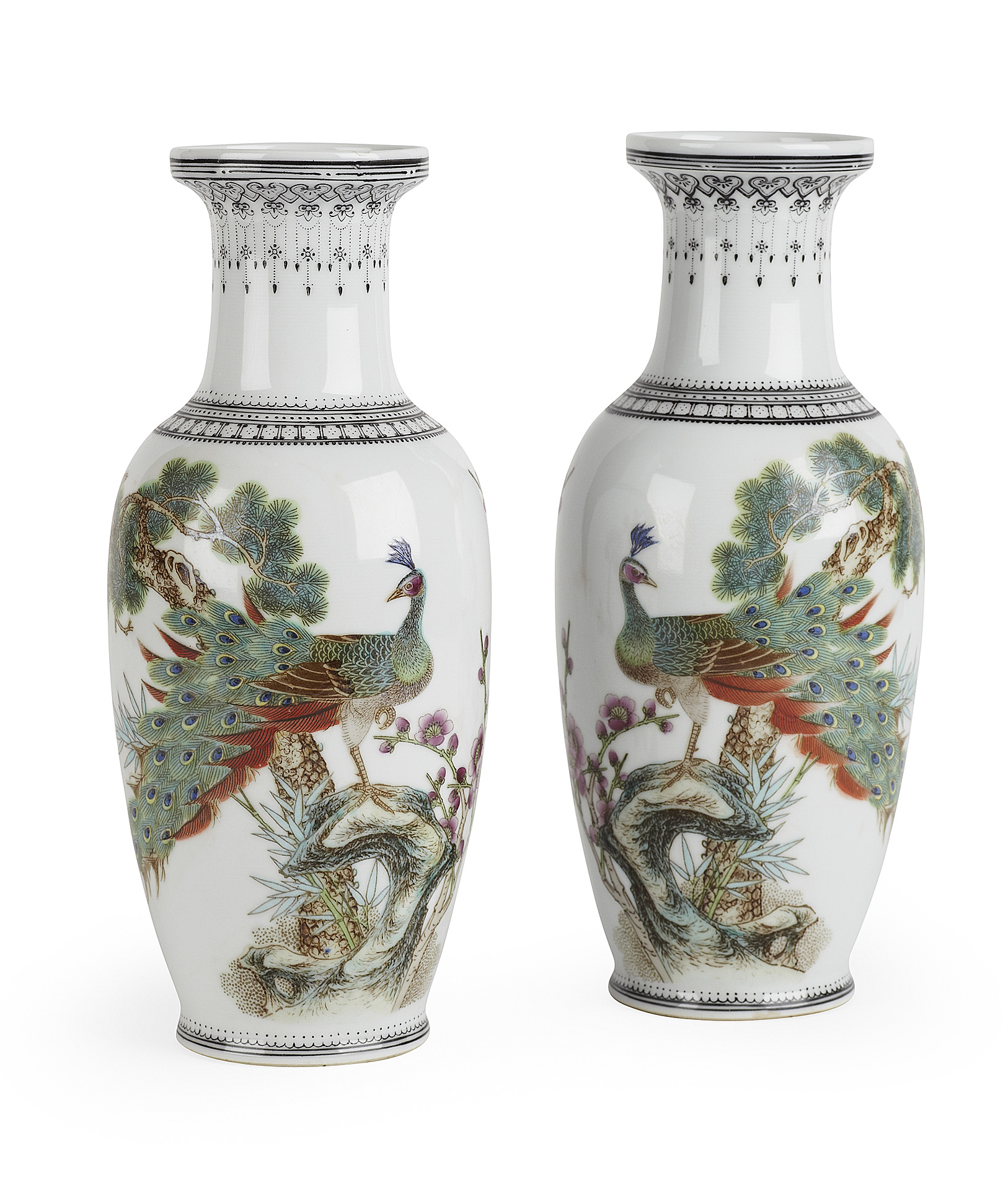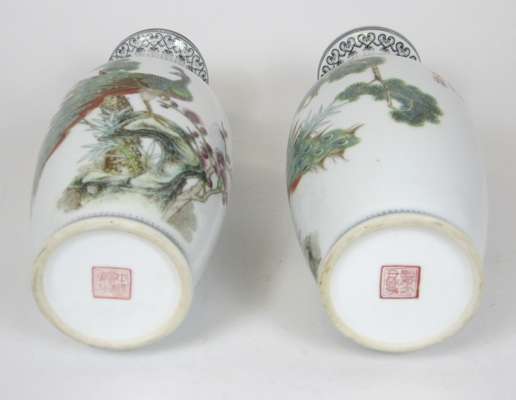 each finely painted with a peacock standing on a rock beside pine and prunus trees, the mouth, neck and shoulder with black banding, bearing inscriptions and red seal marks (2)