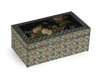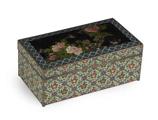the rectangular cover with peonies and butterfly within a blue and green geometric border, the sides with diamond diaper pattern with flower centres, the interior in light green enamel, four character signature to the base