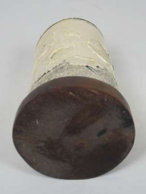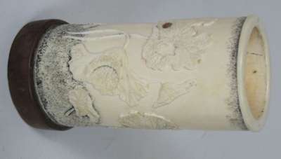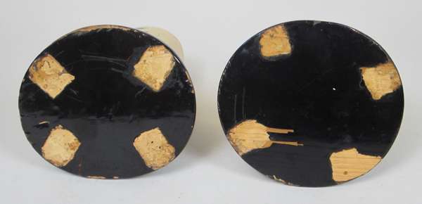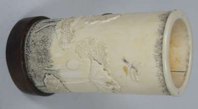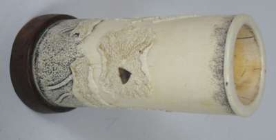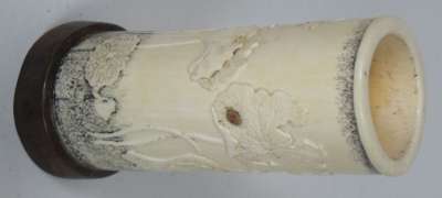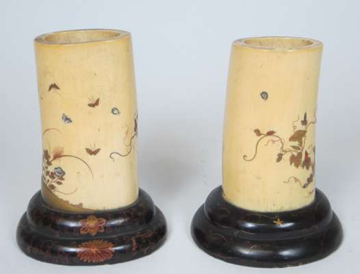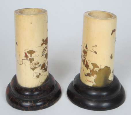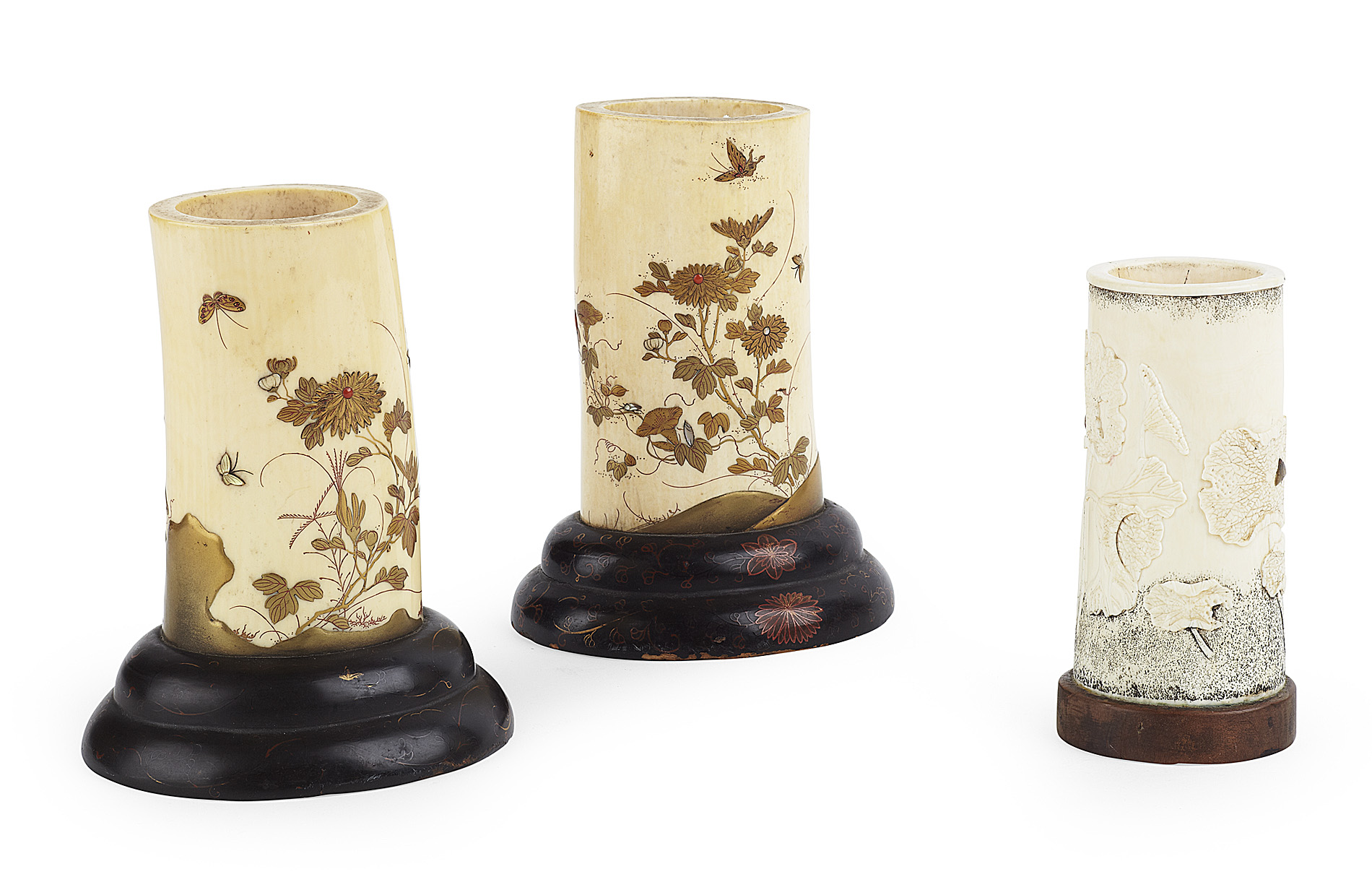 each tusk section decorated with gilt flowering plants, rocks and insects, on oval moulded black lacquer bases; together with a smaller SHIBAYAMA AND IVORY TUSK VASE carved in low relief with lotus plants and insects, with a black powdered ground at the neck and base, on a hardwood base (3)