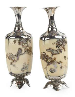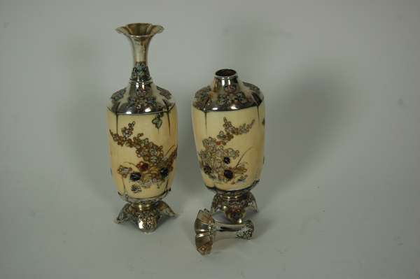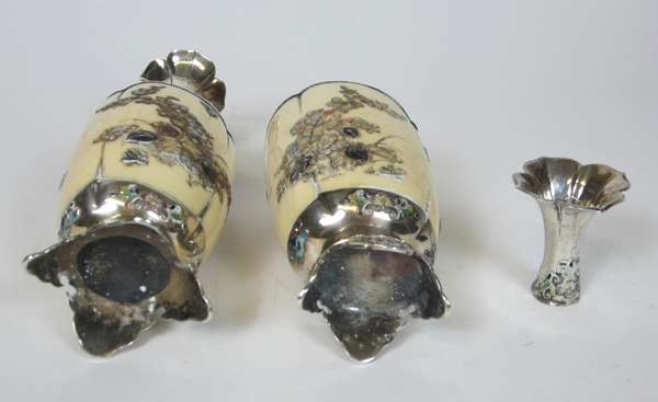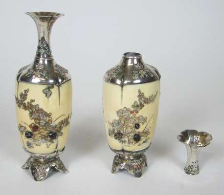 PAIR OF JAPANESE SILVER MOUNTED SHIBAYAMA VASES