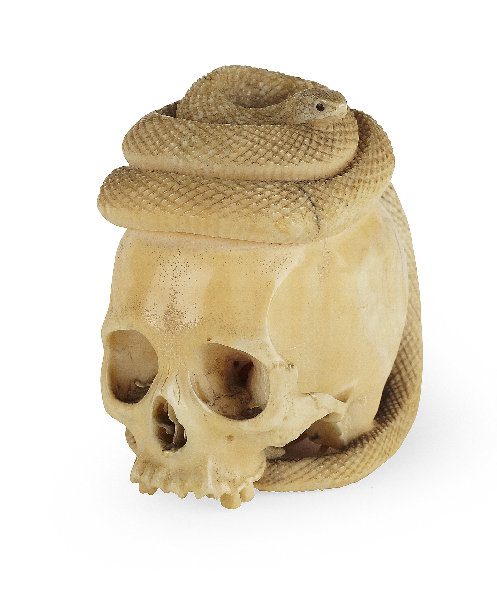 fully carved as a human skull surmounted by a coiled snake