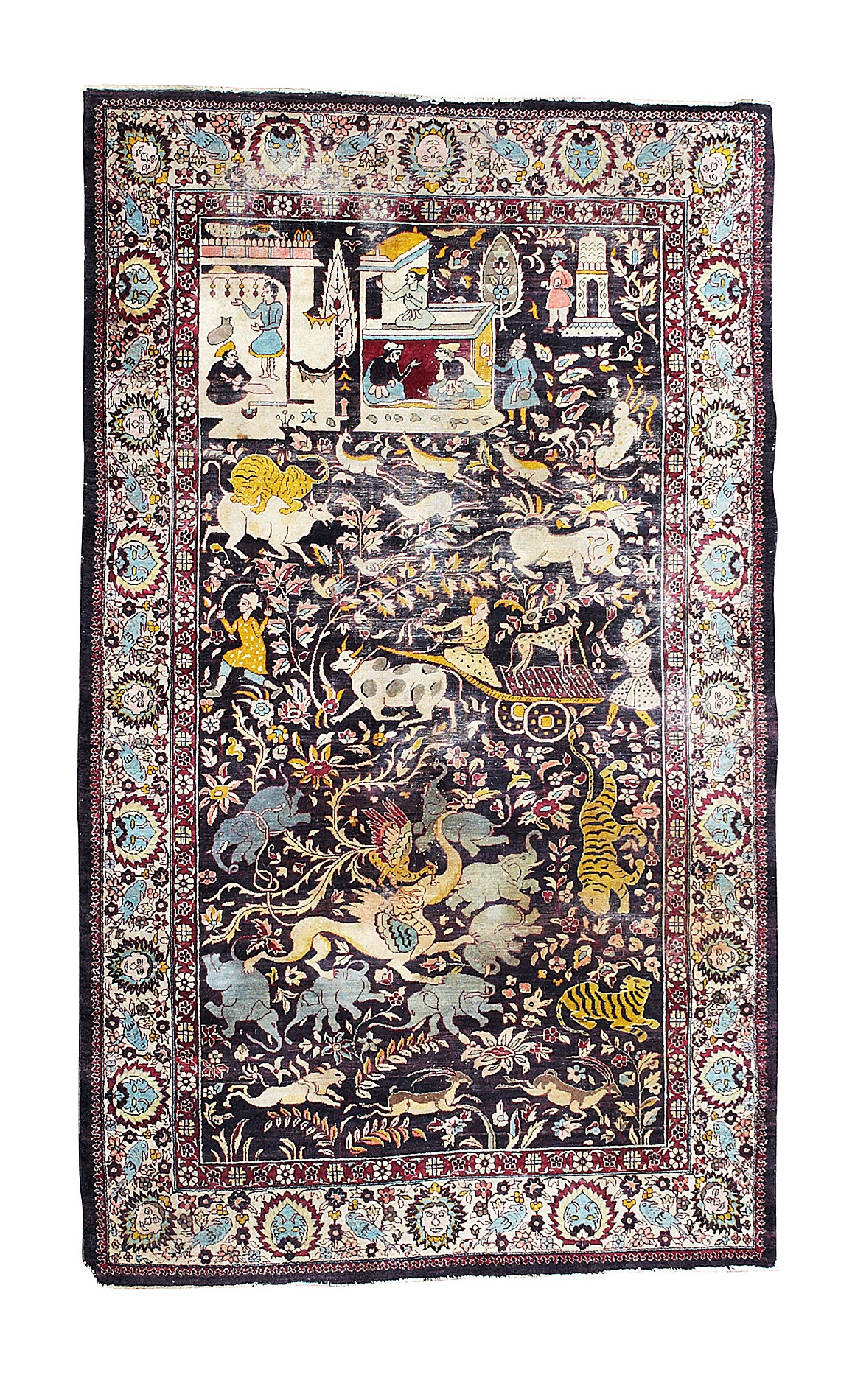 the dark brown field with fantastical beast surrounded by elephants, tigers and other animals to the lower section and with figures in buildings to the top, within camel head-in-palmette, bird and foliate vine border between bands