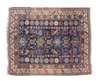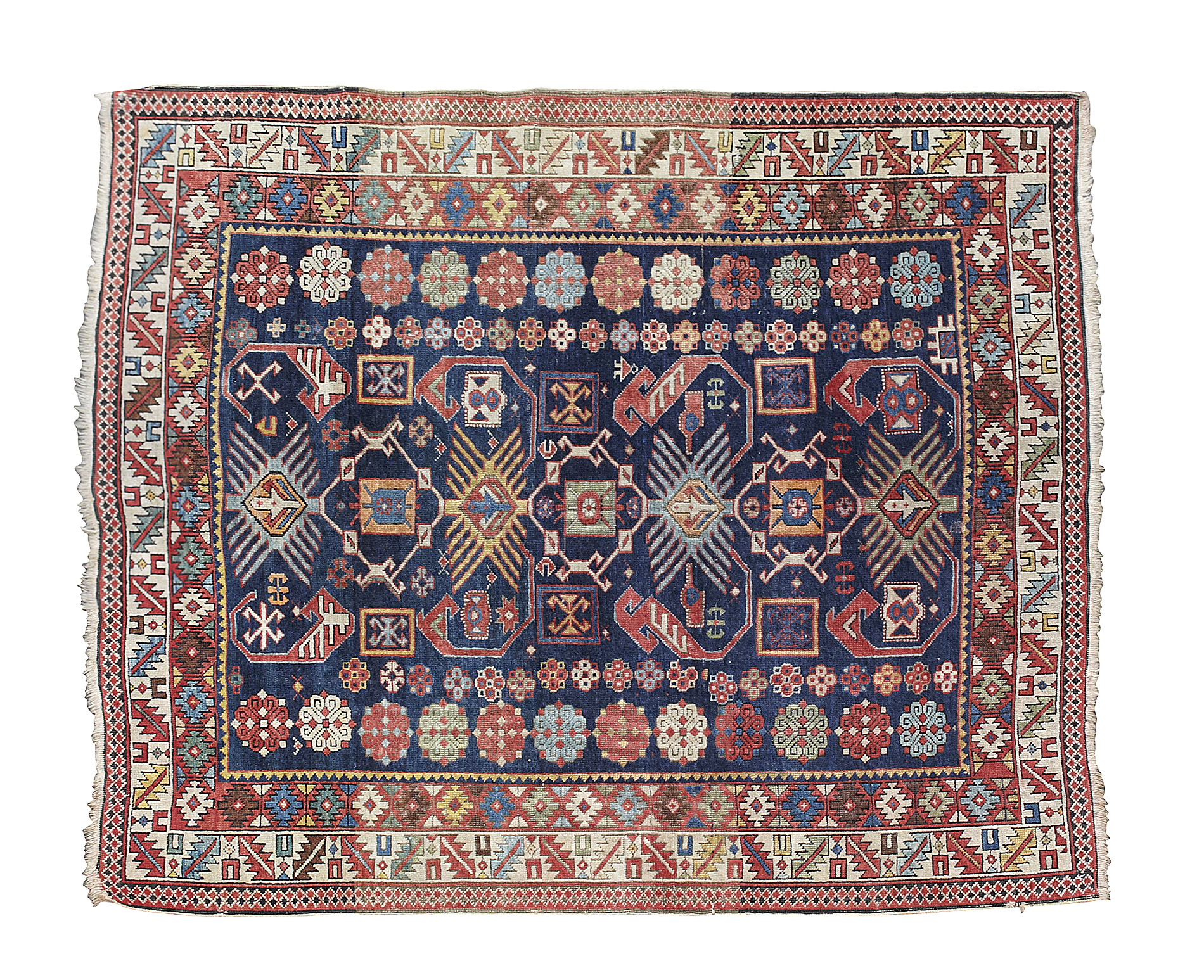 the indigo field with central column of four polychrome starburst medallions flanked by red winged motifs and rosette columns, within red serrated lozenge and cream wine glass and serrated leaf borders with outer skittle band