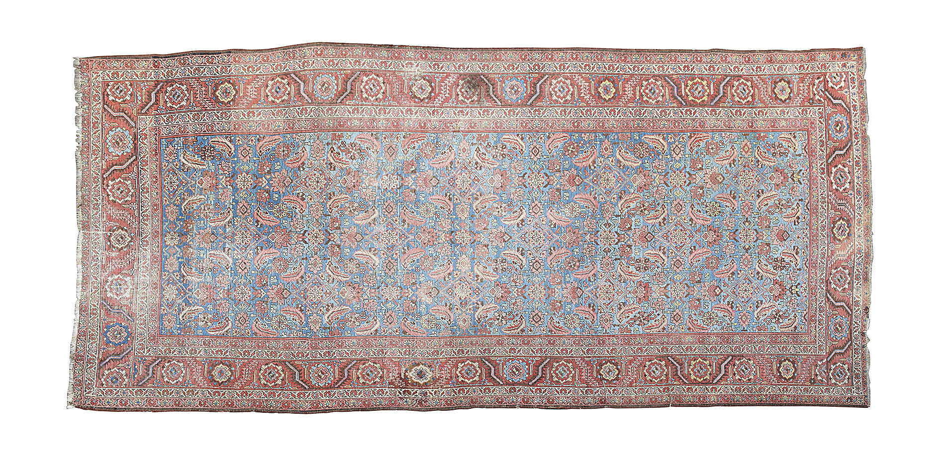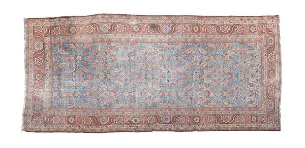 the abrash light blue field with allover herati pattern, within brick red rosette and serrated leaf vine border between bands