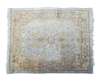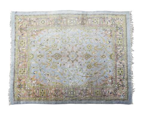 the light blue field with central salmon pink and cream medallion suspending pendants, similar spandrels, within salmon pink palmette and foliate vine border between bands