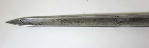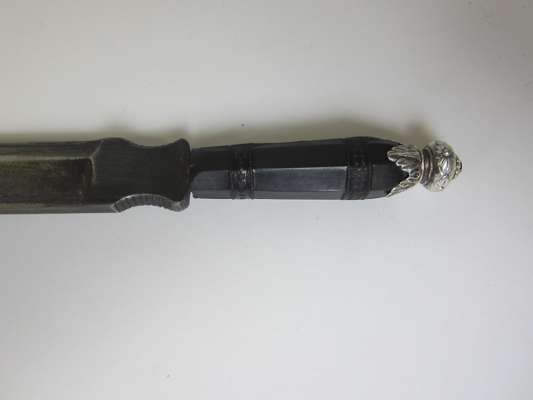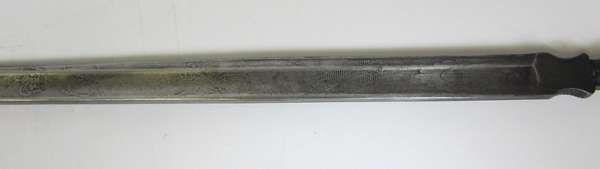 the blade with etched decoration and thumb grips, fitted with a facetted ebonised grip with white metal pommel; with an associated leather clad walking stick with removable gilt metal handle and void interior