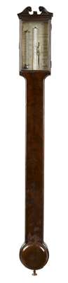 the swan neck pediment over twin thermometer/ barometer with silvered backplate above a long plain case and circular terminus, signed 'Guarnerio/ Huntingdon', mercury filled
