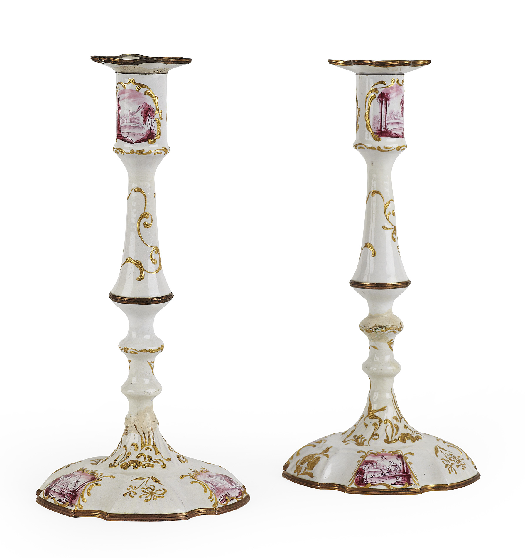 PAIR OF STAFFORDSHIRE ENAMEL CANDLESTICKS