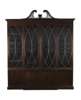 the fret pierced broken swan neck pediment above a dental moulded cornice and four astragal glazed panel doors, above two dummy and two real central panel doors, raised on a plinth base