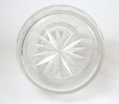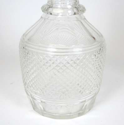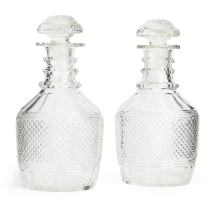 of mallet form with relief diamond cut banded bodies and facetted ring necks, the mushroom stoppers also with relief diamond cut (2)