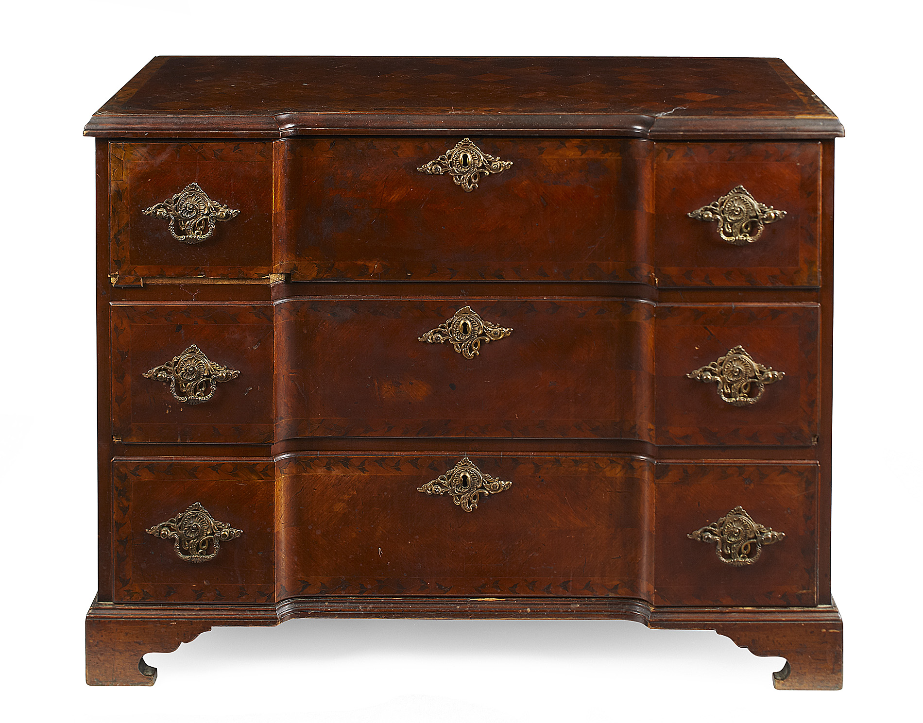 CONTINENTAL INVERTED BREAKFRONT MAHOGANY AND PARQUETRY COMMODE