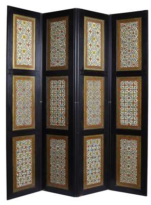 VICTORIAN EBONY AND PAINTED LEATHER FOUR FOLD SCREEN