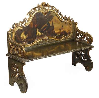 VENETIAN PAINTED AND PARCEL GILT BENCH