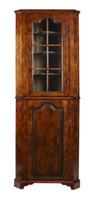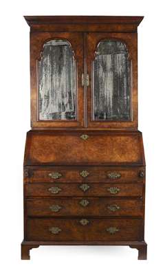 GEORGE I STYLE BURR WALNUT AND OAK BUREAU BOOKCASE