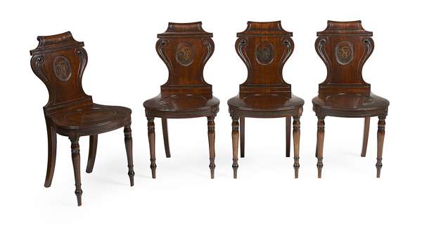 SET OF FOUR WILLIAM IV MAHOGANY AND EBONISED HALL CHAIRS