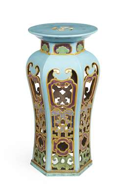 in the Chinese taste with circular top and openwork sides, in blue and pink glaze, impressed marks