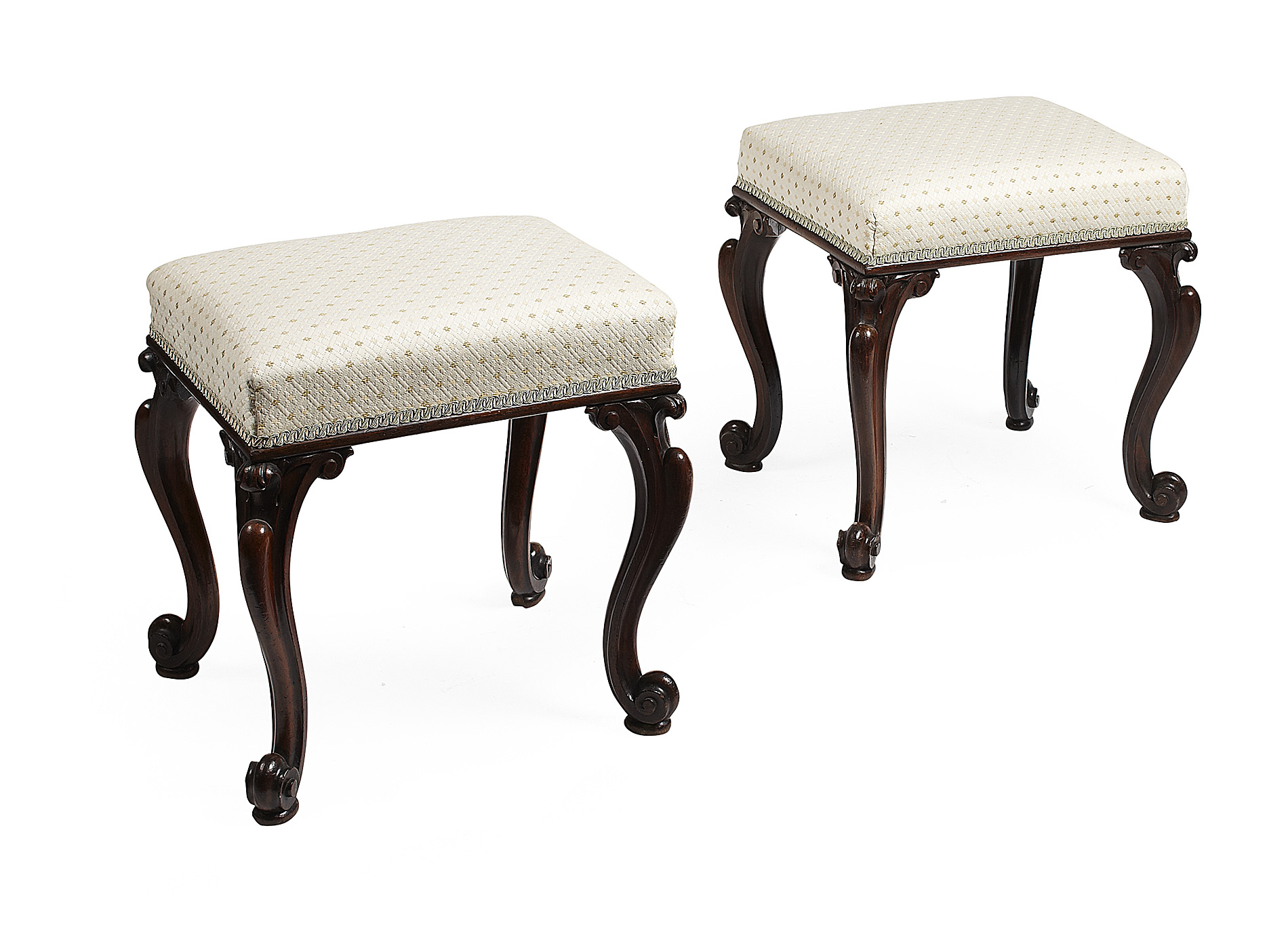 the padded stuffover seats raised on scroll carved cabriole legs (2)
