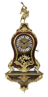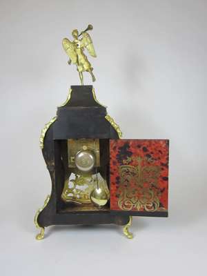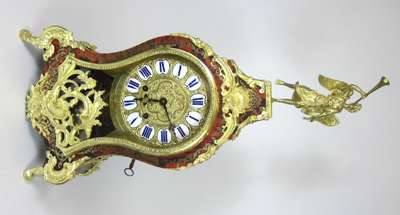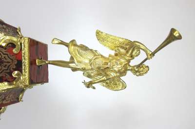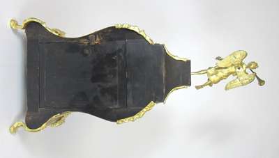 together with a bracket, of balloon form, the gilt dial with white enamel chapters and a bell sriking eight day movement, surmounted by an angel blowing a horn, raised on rococo scroll feet