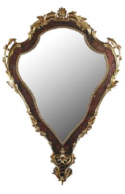 the shaped bevelled mirror plate in a red tortoiseshell and boulle marquety frame with rococo gilt metal mounts