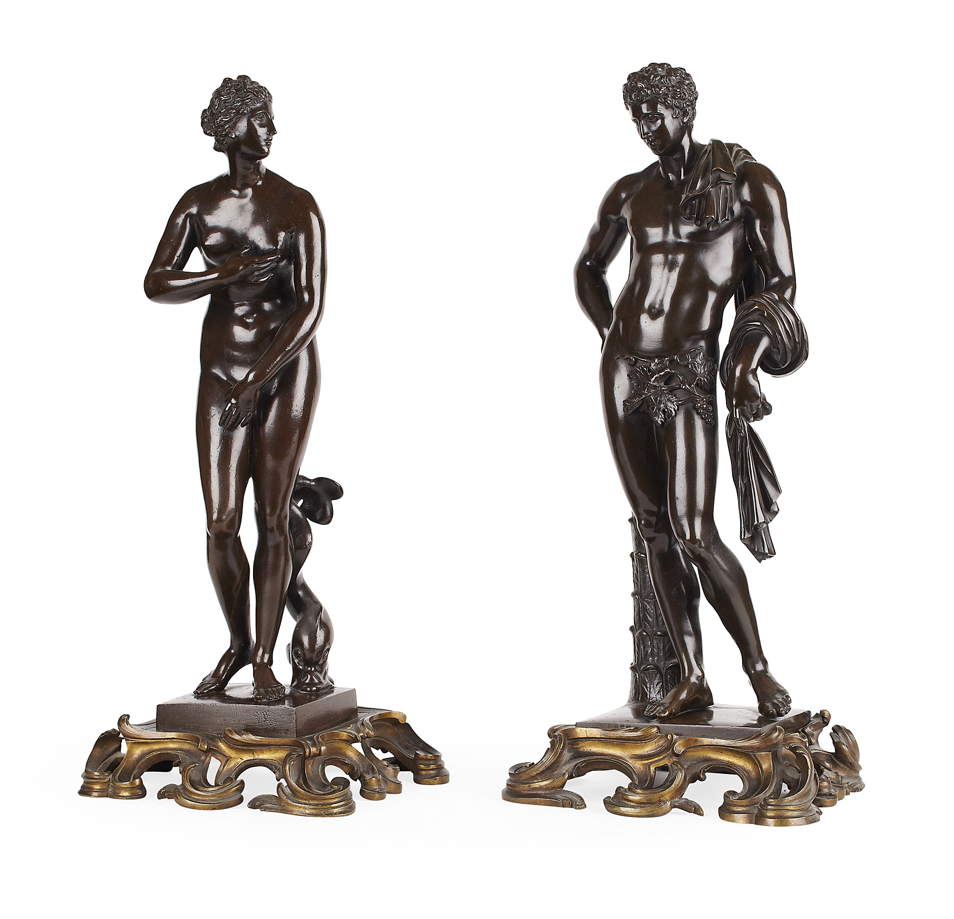 after the antique, dark brown patina, on scrolling gilt bronze bases (2)