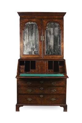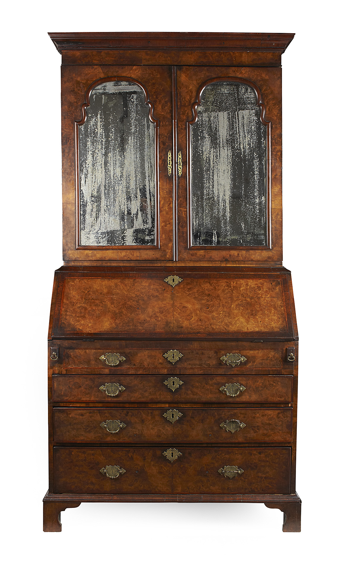 in two parts, the moulded cornice above a pair of arched moulded mirror doors opening to shelves; the lower part with a crossbanded slant front opening to an interior fitted for writing with a recessed well, above one dummy and three long graduated drawers, raised on shaped bracket feet