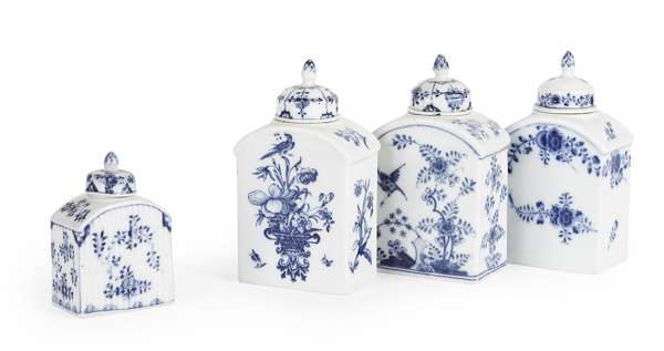FOUR CHINESE EXPORT BLUE AND WHITE TEA CADDIES