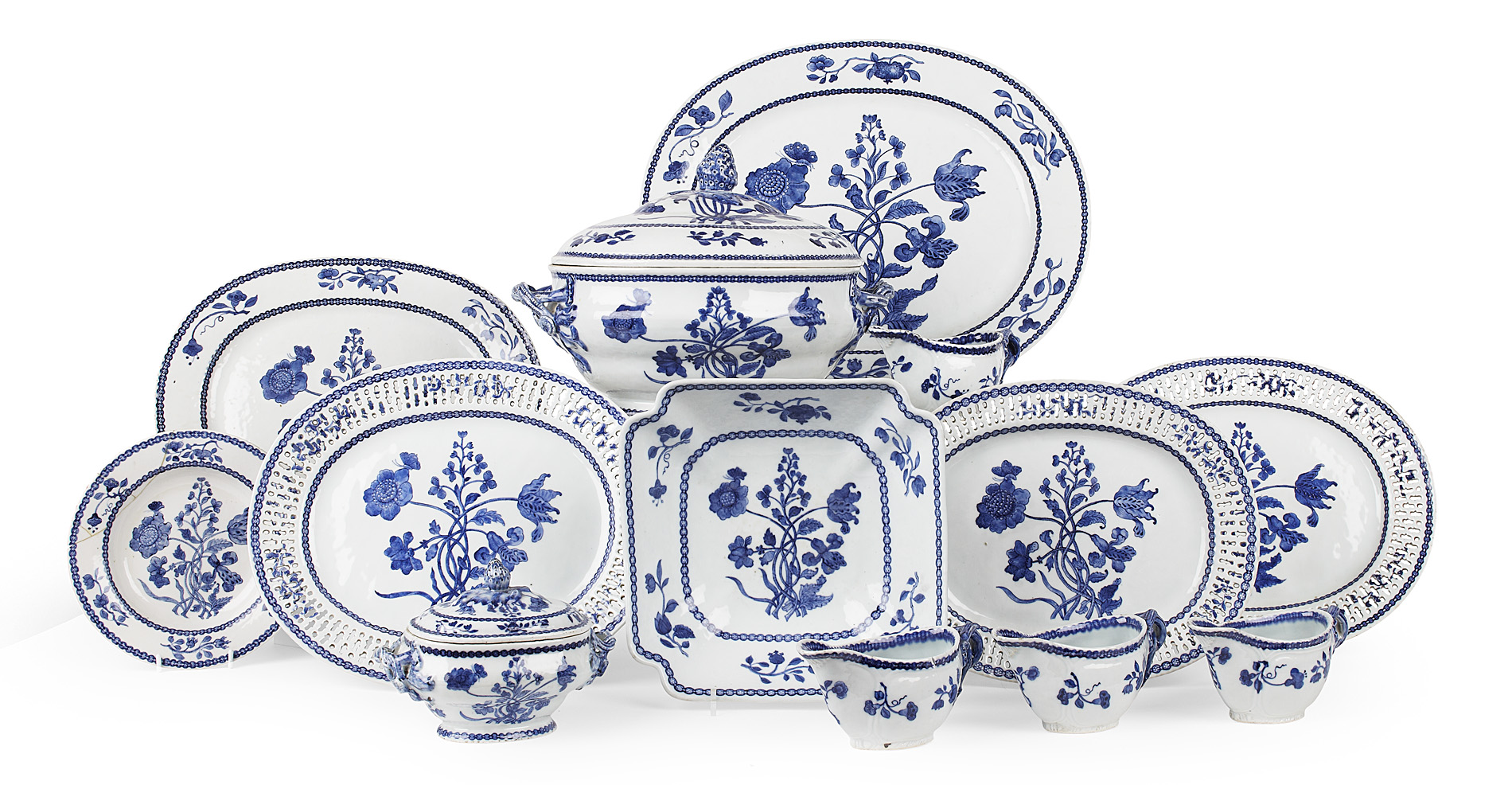 decorated in the Dutch taste with a bouquet of tulips and peonies, butterflies and persimmons; comprising a covered tureen with berry finial and vine handles, four sauce boats, a sauce tureen, a square bowl, a small dish, three reticulated platters, two medium platters, a large platter, and a meat platter (insert lacking)