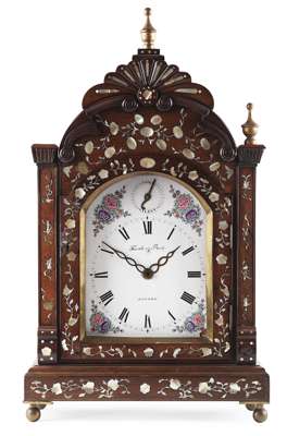the arched case with fan moulded cresting and urn finials, above an arched white enamel Roman numberal dial painted with floral spandrels and inscribed 'Thwaites & Reed/ London', with Silent/Strike subsidiary dial, eight day movement striking on two gongs, the case with floral mother of pearl inlay throughout, on brass ball feet