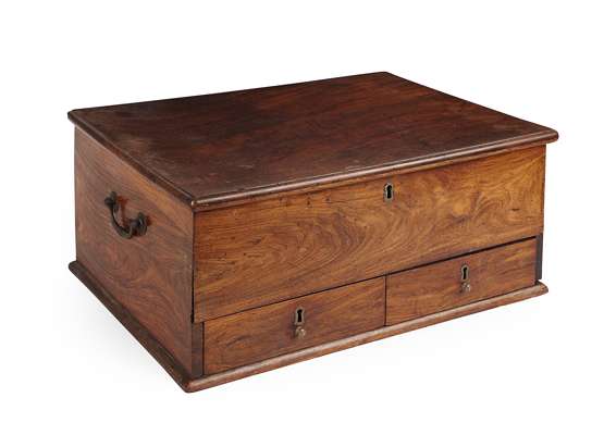 the hinged top opening to a void interior, over two short base drawers, with handles to the sides
