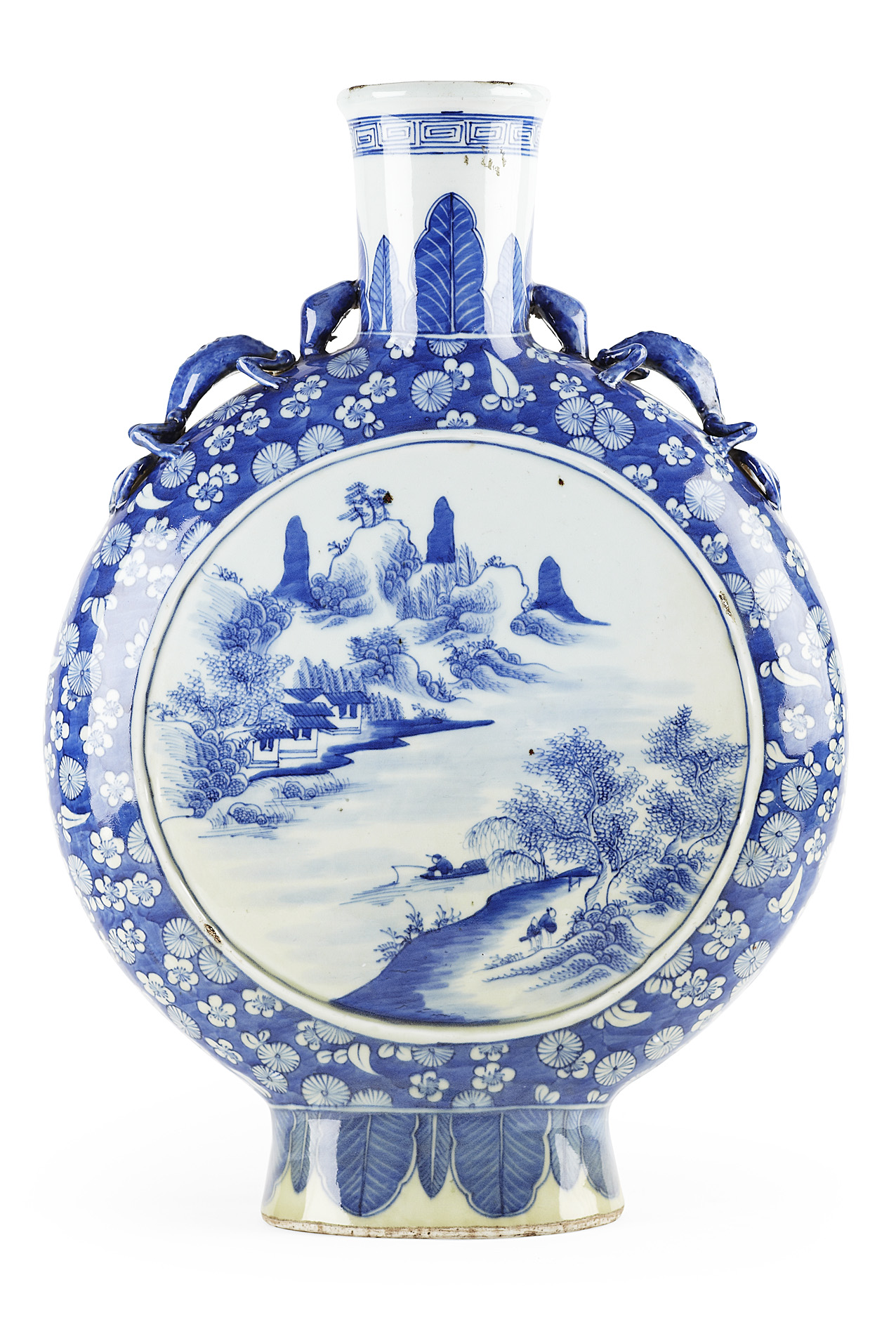 the sides decorated with circular reserves depicting fishing hamlets, against a blue ground painted with prunus and chrysanthemum, with qilong on the shoulders and lappet decorated neck and foot rims, unmarked