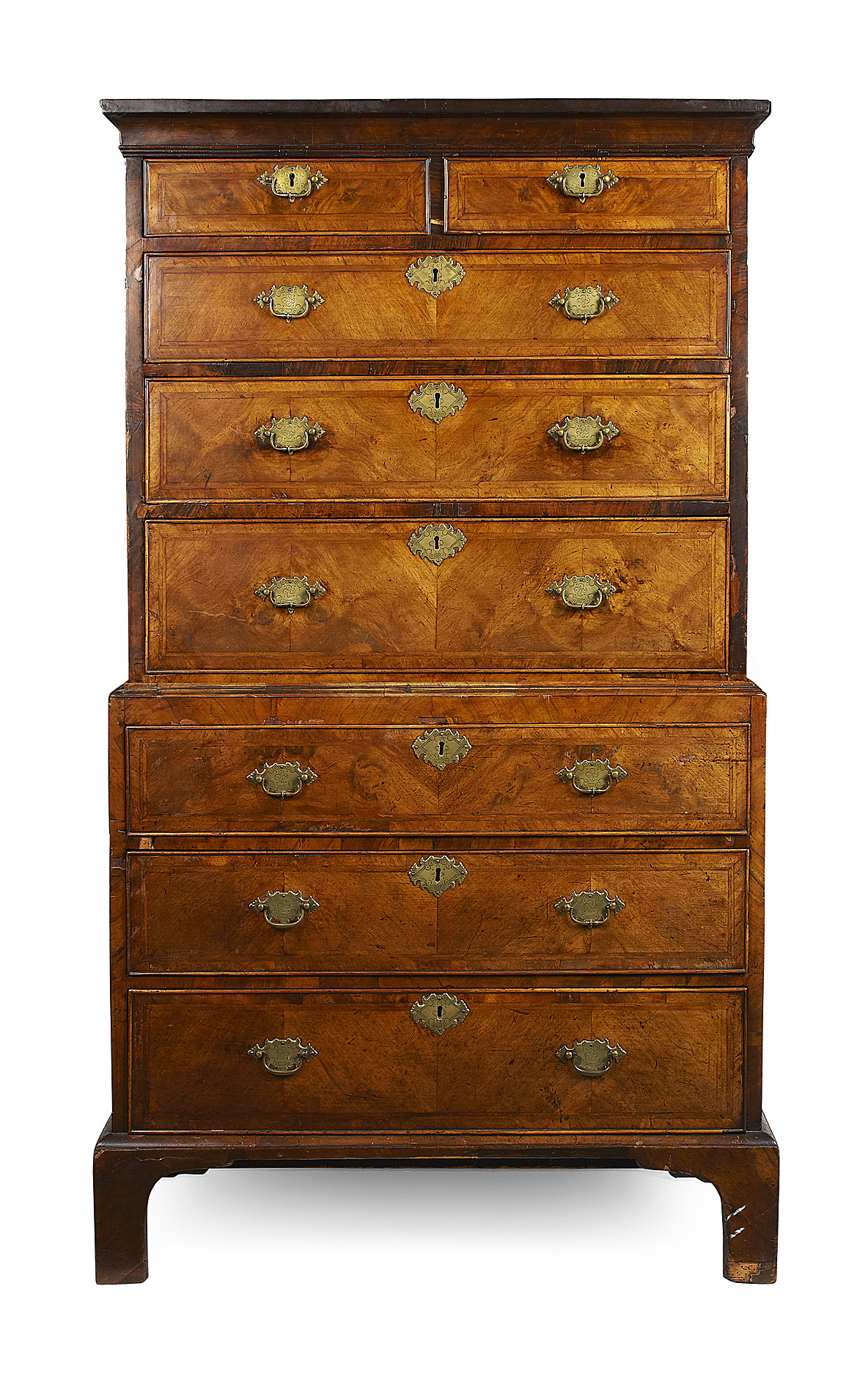 GEORGE II WALNUT BANDED AND PAINTED CHEST ON CHEST