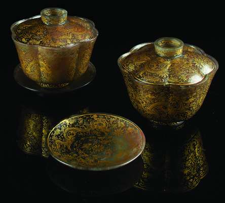 with domed lids and lobed sides, finely decorated in gilt with writhing five-clawed dragons, amongst a dense scrolling foliage, the undersides similarly decorated in gilt with dragons, the saucers base centred with the double square enclosed character mark encircled by a large peony blossom sprouting leafy scrolls, the bowls with single square enclosed marks (2)