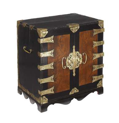 of cubic form with side handles and engraved brass corner mounts and hinges, opening to an interior with an arrangement of red lacquer drawers