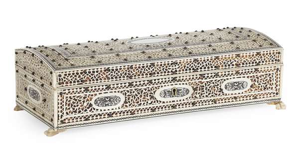the slightly domed cover and sides with finely cut and pierced scrolling foliate ivory bands and penwork details and allover nail head decoration, raised on carved ivory lion paw feet