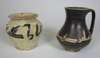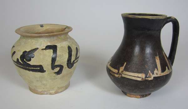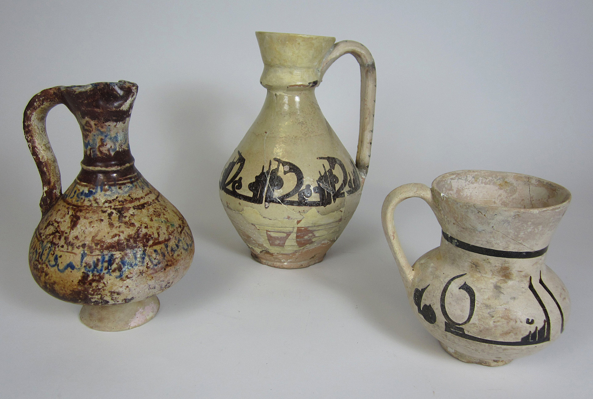 the ovoid sides decorated in underglaze brown with Cufic characters 25cm high; together with three further Persian pottery ewers and a small vase (5)