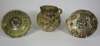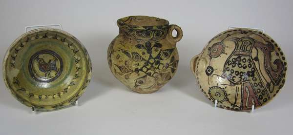 centrally decorated with a stylised bird, within a green/brown design border, 17cm diam; together with a Persian bowl with a spouted rim and a buff pottery vase, 17cm high (3)