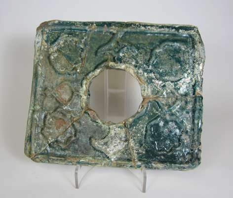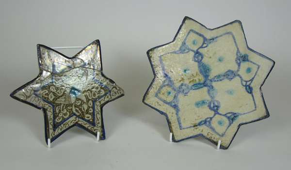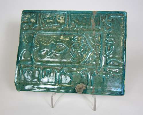 decorated in relief with inscriptions and styised motifs, 34cm x 28cm approx; together with two Persian six pointed star pottery tiles, Iran, 12th or 13th Century (4)
