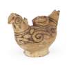 modelled as a styised ram, 13cm high; together with a buff pottery ewer, with a mask finial and pierced neck, 23cm high (2)