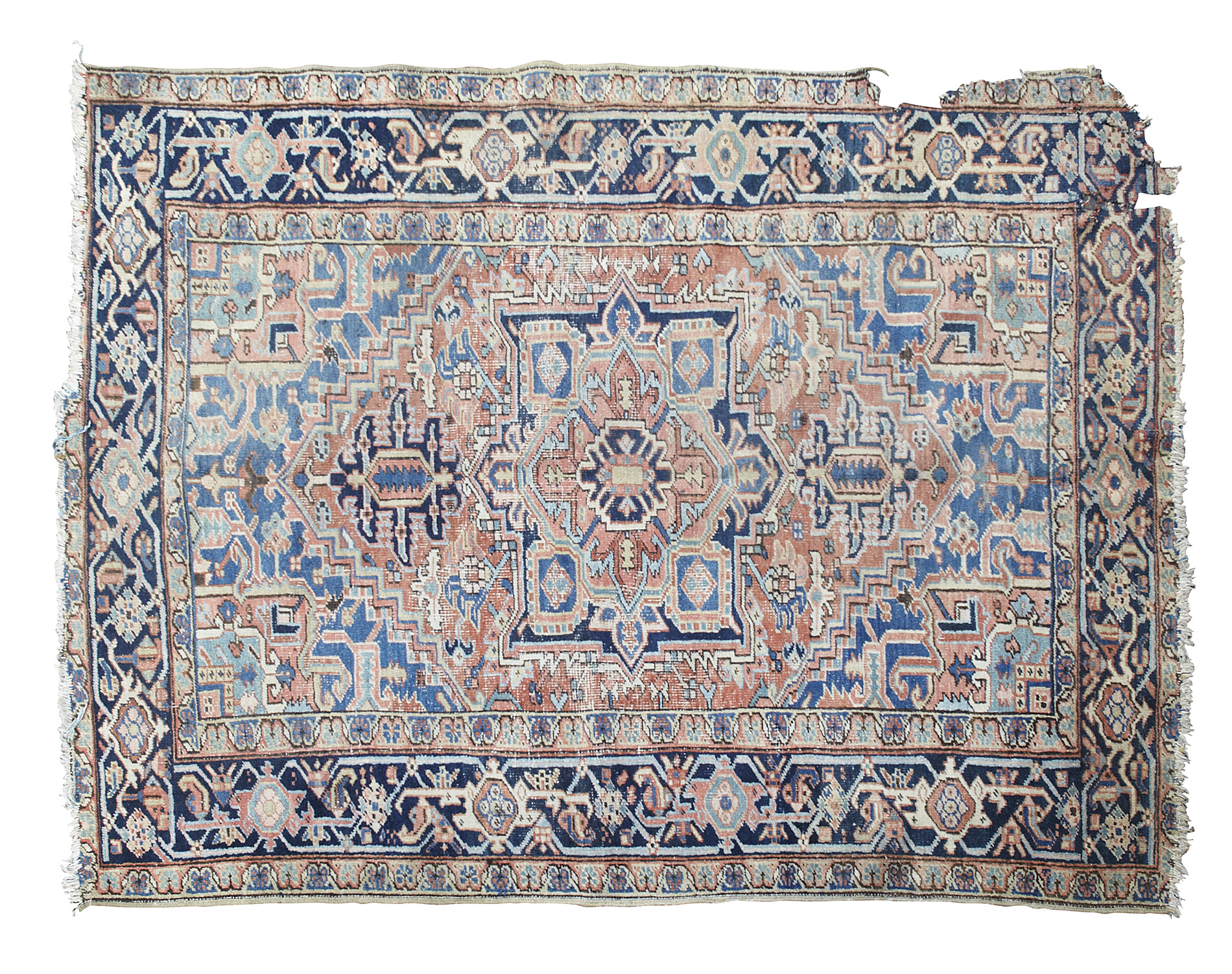 the brick red field with square indigo medallion, blue spandrels, within indigo turtle palmette border between bands