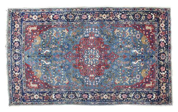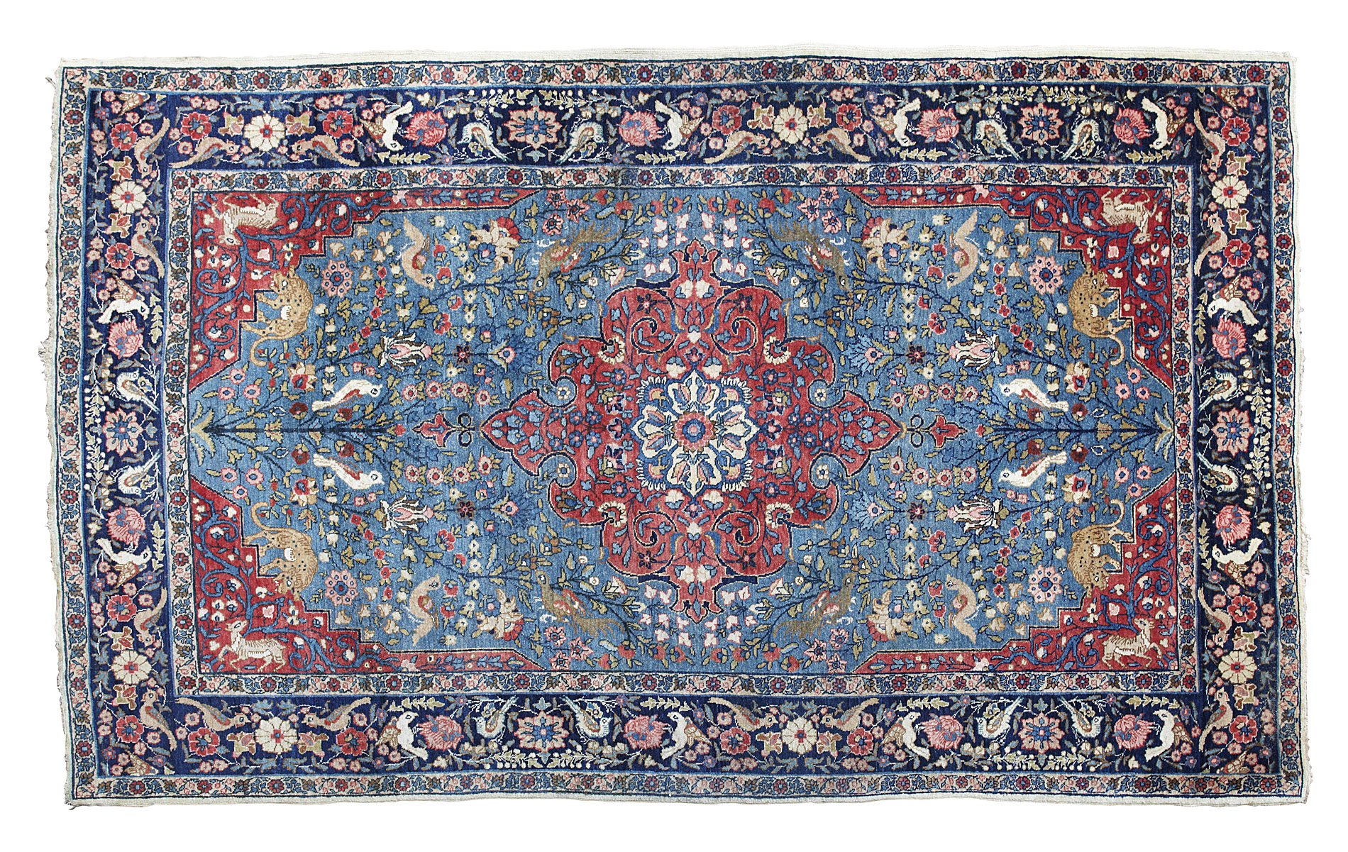 the blue bird in foliage field with central red medallion, red spandrels with animals, within indigo bird and foliate vine border between cream bands