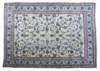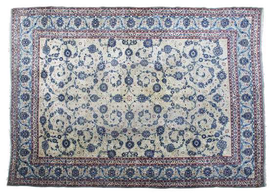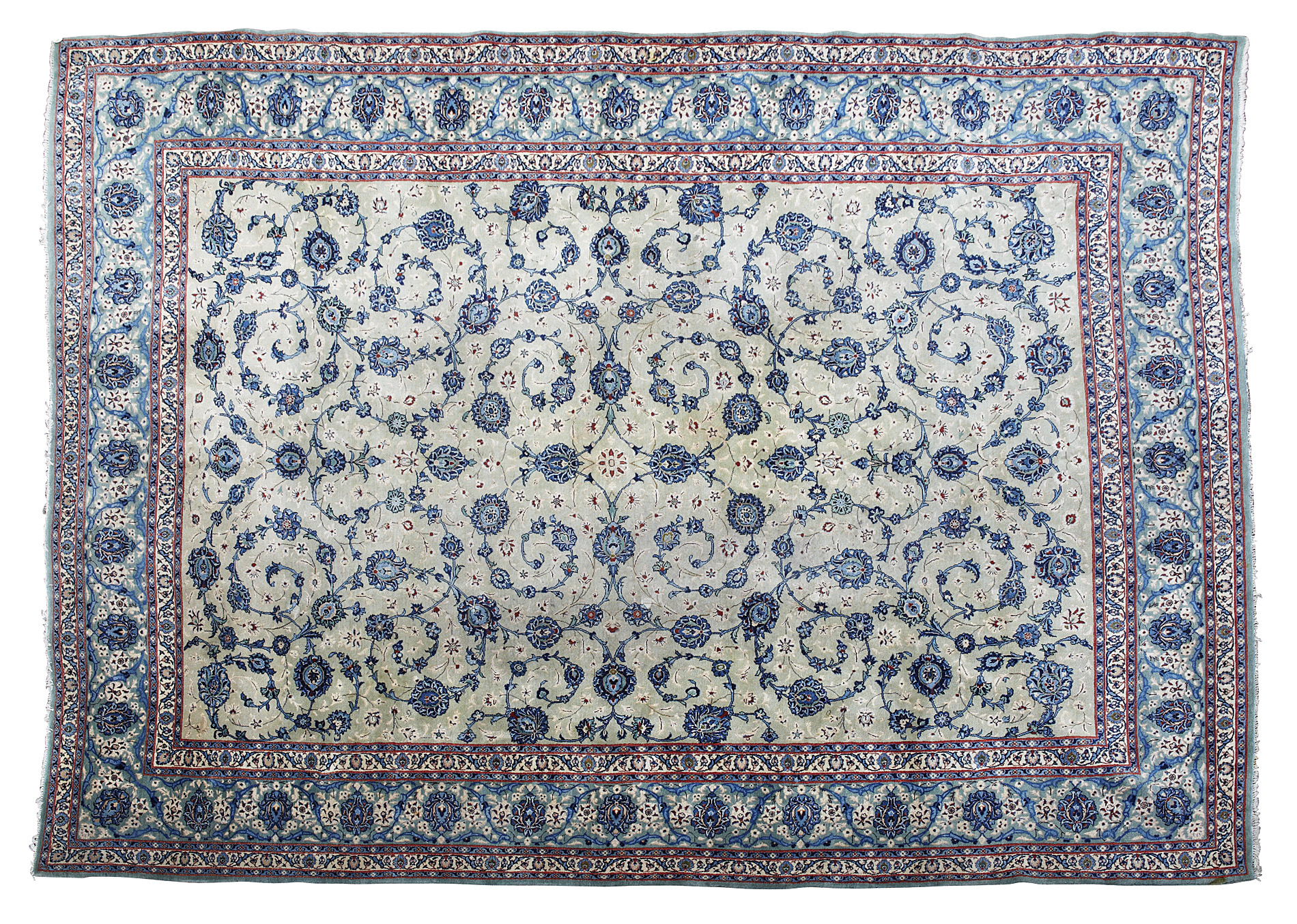 the light blue field with allover blue palmette and scrolling vine pattern, within similar border between ivory bands