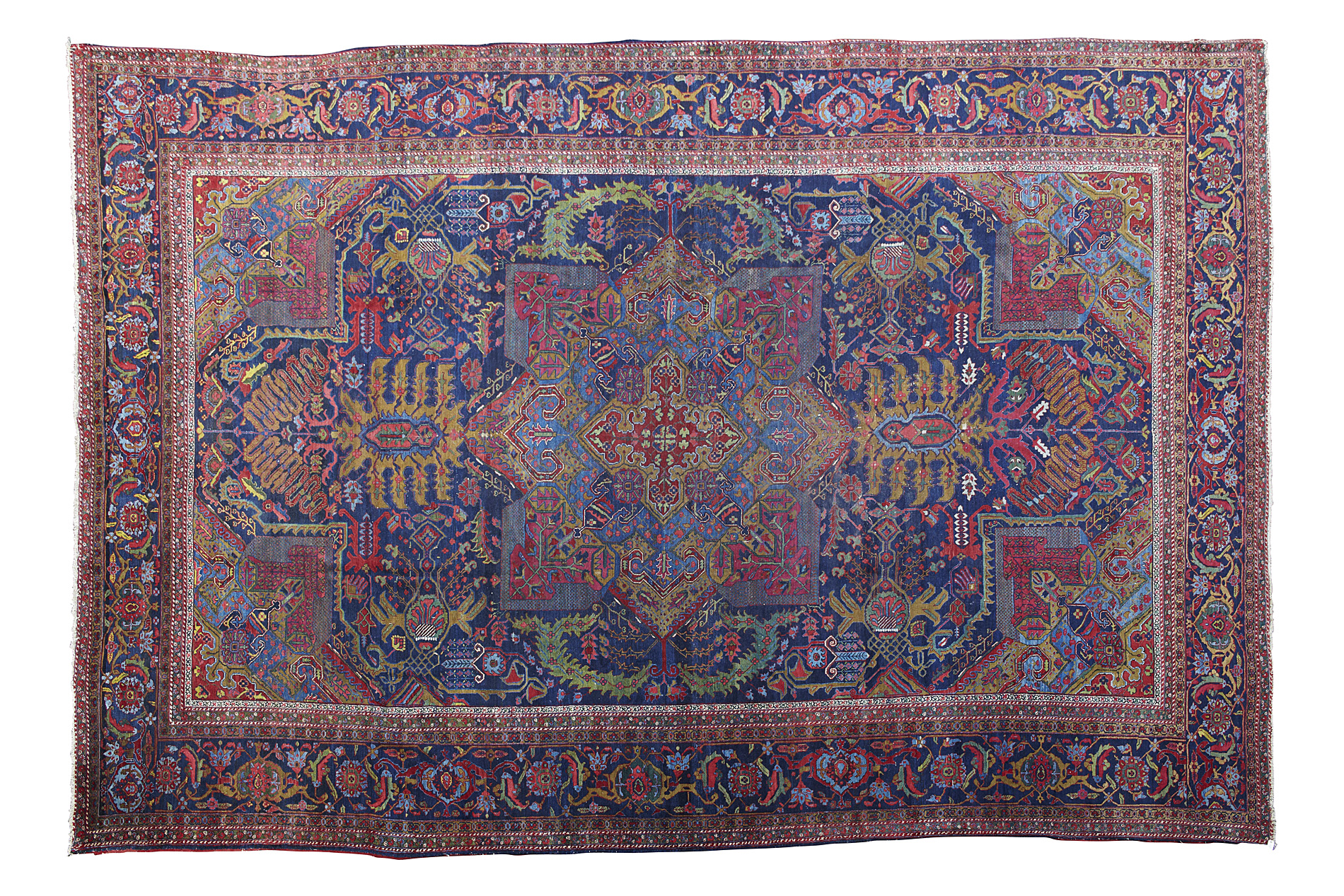 the indigo field with large olive and blue medallion suspending pendants, similar spandrels, within indigo turtle palmette, rosette and vine border between bands