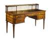 the superstructure with a pierced brass gallery raised on fluted columns and a brasse grille surround, above a shaped black tooled leather insert writing surface and central frieze drawer over an arched kneehole, flanked by pairs of short drawers, with lateral pull-out leather line slides, raised on tapered legs with stop-fluted corner blocks, the drawers stamped 'Wright & Mansfield, 104 Bond Street'