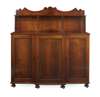 of breakfront outline, the scrolling back panel over a single tier raised on turned supports; the lower part with a central moulded panel door flanked by further cupboard doors, raised on turned bun feet with recessed castors