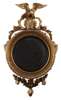 the circular mirror plate within an ebonised reeded slip and a laurel wreath moulded frame surmounted by a shell and carved eagle cresting